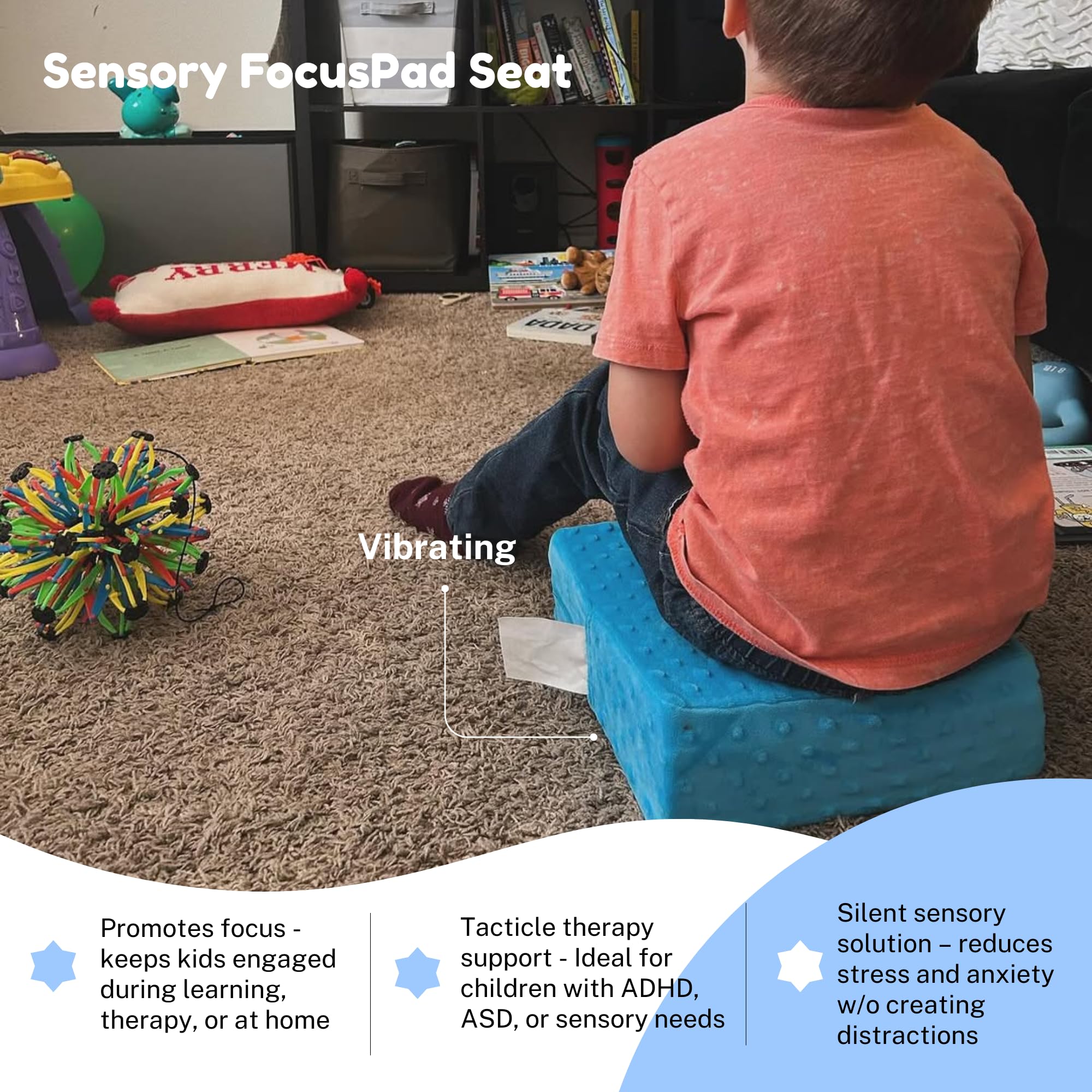 - The sensory feedback that the FocusPad Seat provides is ideal for children on the spectrum, ADHD, or with sensory processing disorder. For children that need more sensory feedback, the FocusPad Seat offers a gentle way to ease them into tolerating more sensations. OTs and Teachers will love the silent multi-use fidget motor aid to use during a therapy session or in the classroom, plus the handle makes it portable and easy to store (put a hook on the wall to store in place).